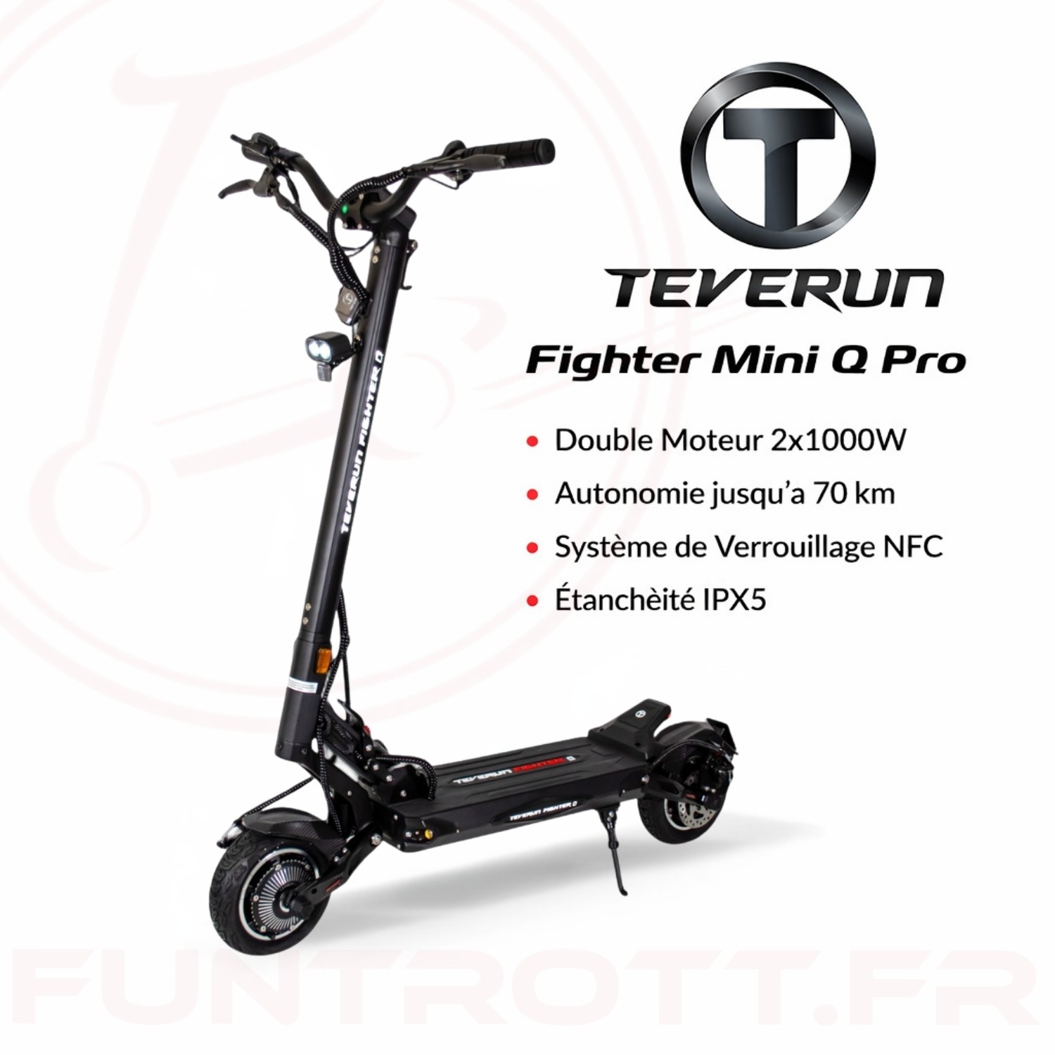 La Teverun Fighter Mini Q Pro est une trottinette électrique qui ne fait aucun compromis. Sous son format relativement compact (roues de 8,5 pouces), elle cache une double motorisation surpuissante et des équipements de pointe pour une expérience de conduite sportive et sécurisée en milieu urbain et périurbain.